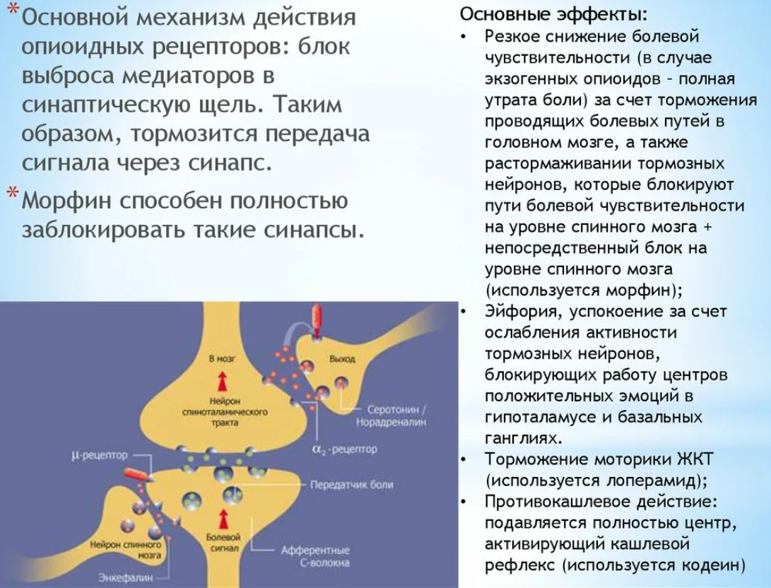 - Запор: Активация μ-рецепторов в кишечнике drastically снижает его перистальтику, что является частой проблемой для пациентов, длительно принимающих опиоиды.