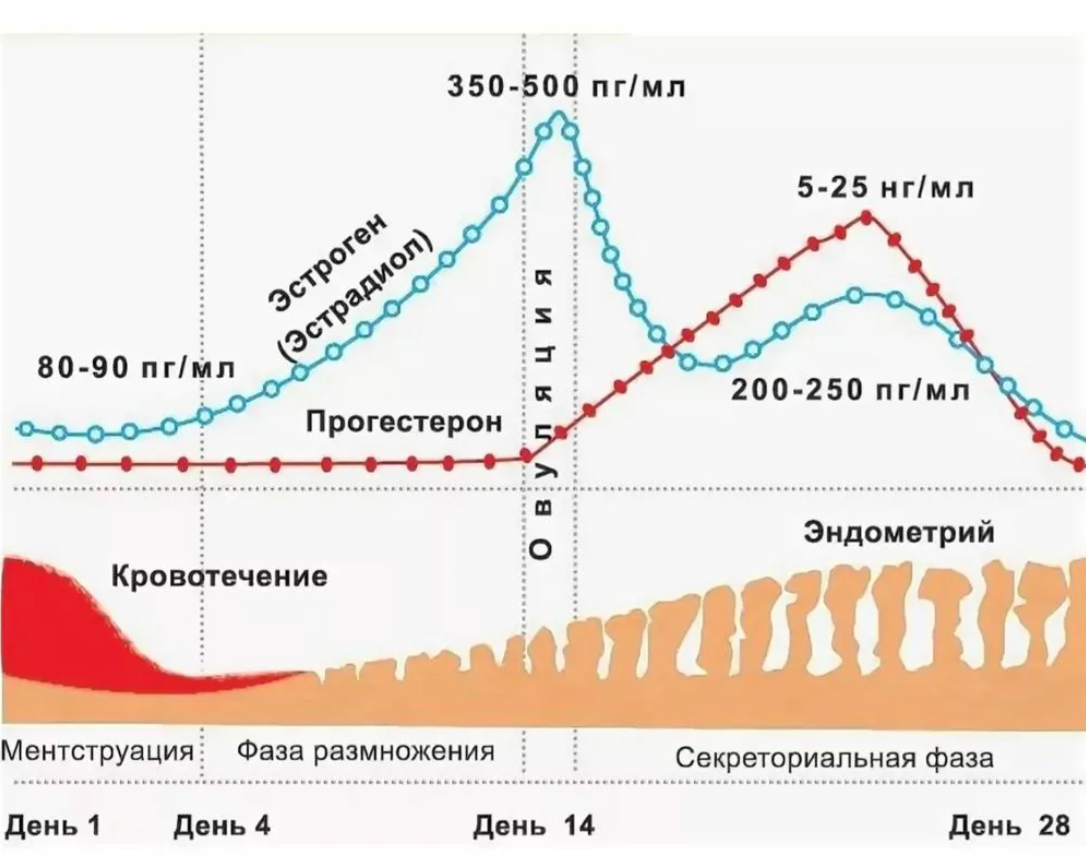 - Регуляция менструального цикла: стимулирует пролиферацию эндометрия в фолликулярной фазе. Достижение порогового уровня E2 запускает положительную обратную связь с гипоталамусом, вызывая пик ЛГ и овуляцию.